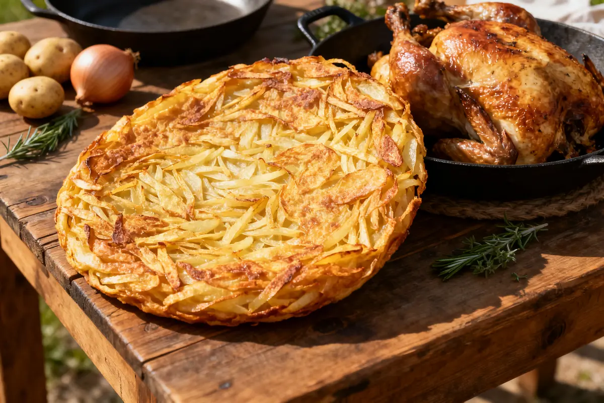 Imaginez une volaille dorée, puis remplacez l’habituel gratin dauphinois par une grande galette croustillante. L’équilibre du repas change instantanément. Cette recette apporte du croquant là où le gratin reste fondant. Elle absorbe le jus de la volaille tout en conservant une belle tenue.